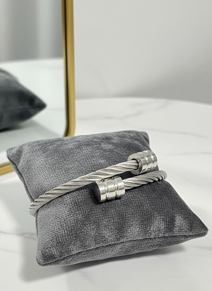 Inspired by modern architecture and timeless strength, the Titanium Cable Bracelet blends minimalist design with industrial sophistication. Its twisted steel cable structure and precision-polished magnetic clasp deliver a sleek and masculine aesthetic — a true statement of refined power.